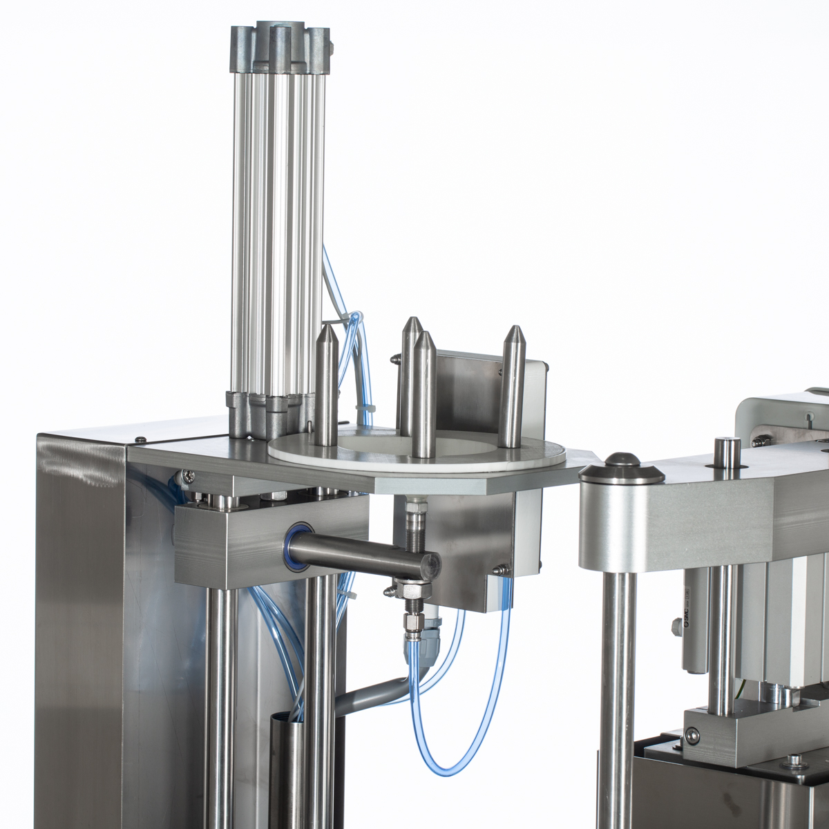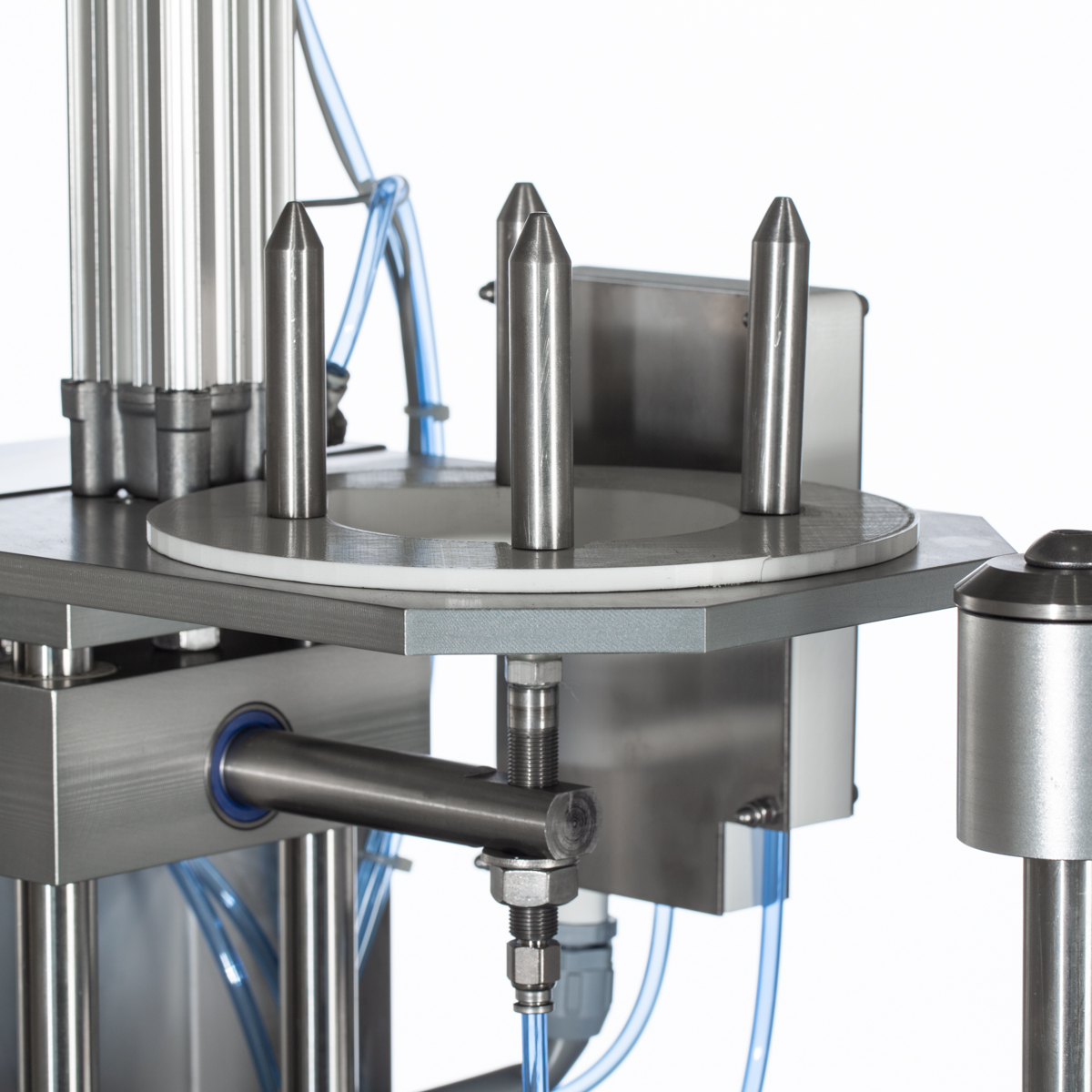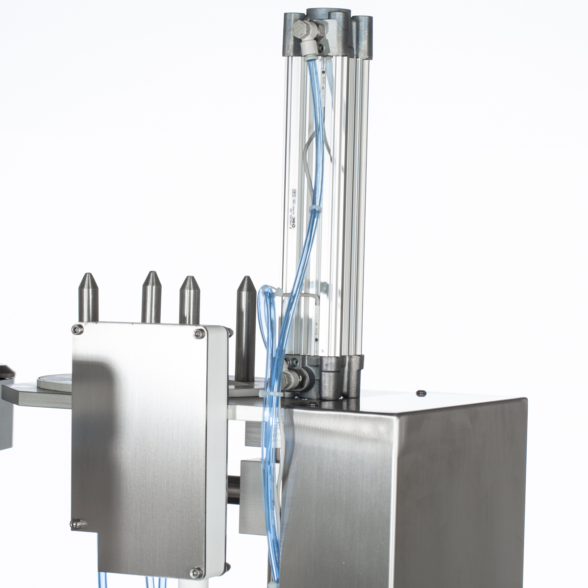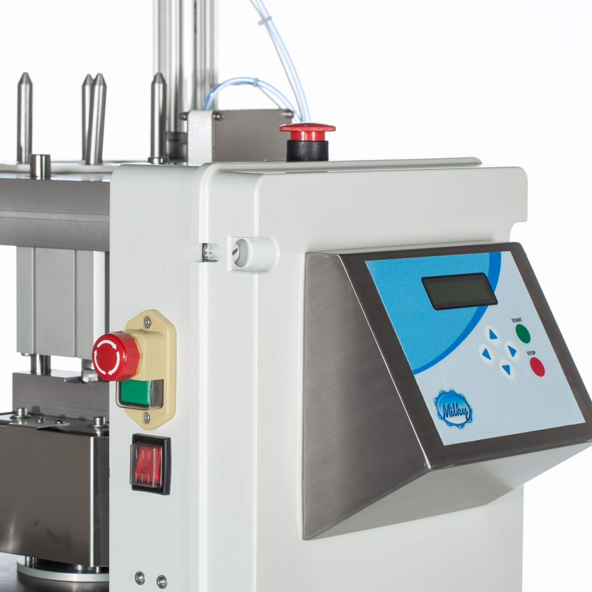 Die pneumatische Verschlussmaschine mit vier Arbeitsstationen verschließt bis zu 600 Einheiten pro Stunde für Durchmesser von 75 bis 95 mm. Bitte geben Sie bei der Bestellung die Spezifikationen an. Ein Kompressor mit 6–7 bar ist erforderlich.