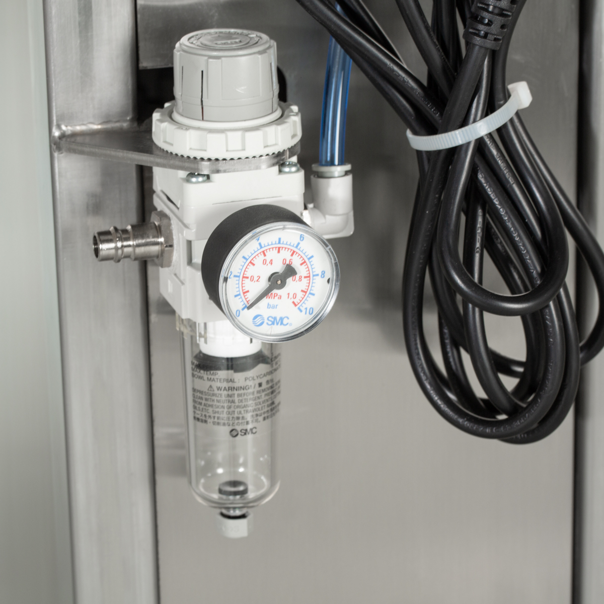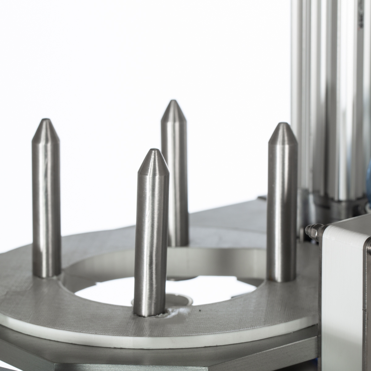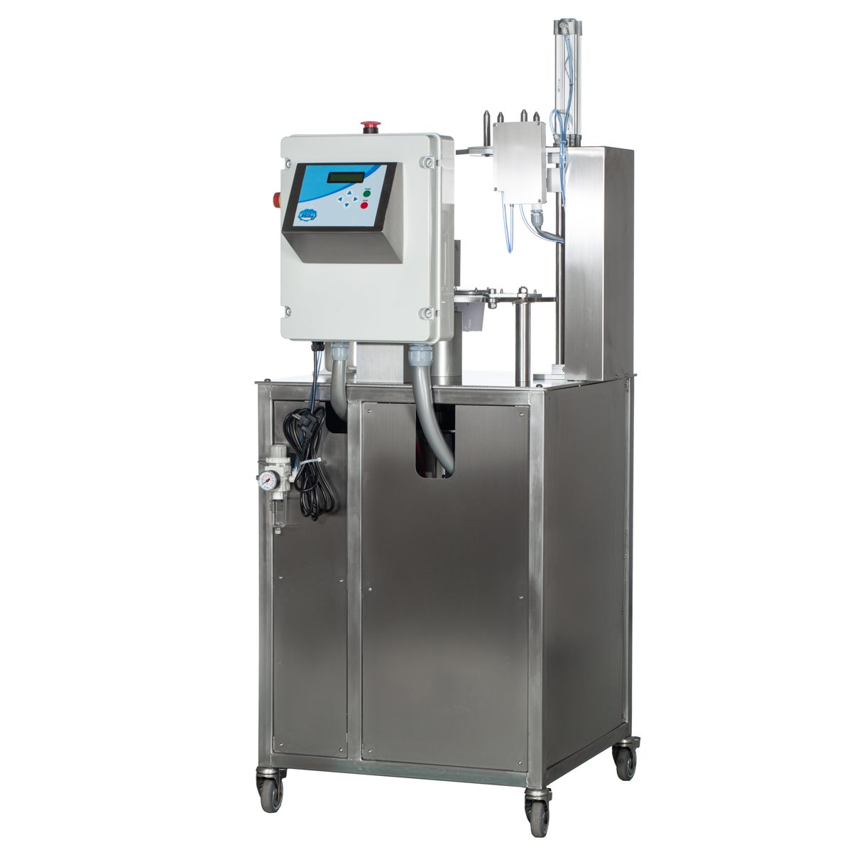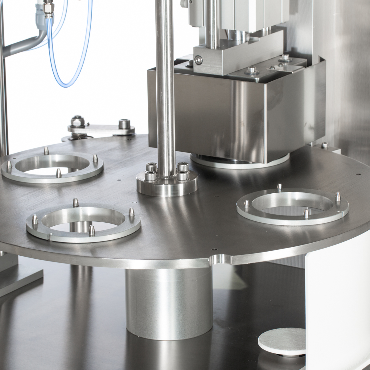Die pneumatische Verschlussmaschine mit vier Arbeitsstationen verschließt bis zu 600 Einheiten pro Stunde für Durchmesser von 75 bis 95 mm. Bitte geben Sie bei der Bestellung die Spezifikationen an. Ein Kompressor mit 6–7 bar ist erforderlich.