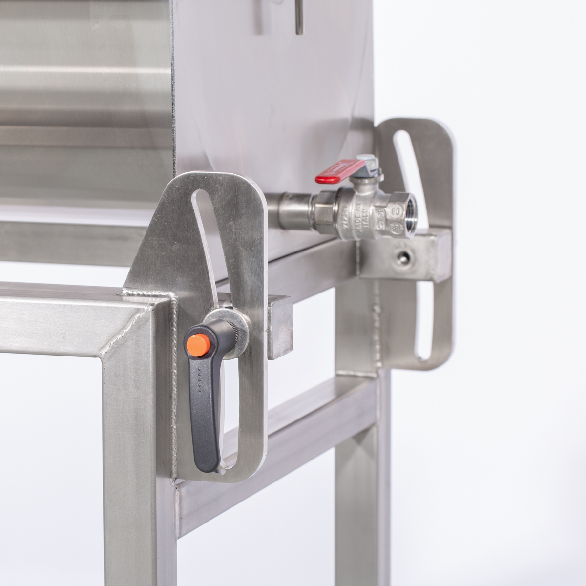 Anfänglich wird die Buttermaschine so gekippt, dass der Auslauf nach oben zeigt. Durch diese Funktion rinnt der Rahm immer nach unten und wird nach oben geschleudert. Am Ende der Herstellung wird die Maschine so gekippt, dass der Auslauf nach unten zeigt. Das Abrinnen der Buttermilch erfolgt durch die Schwerkraft.