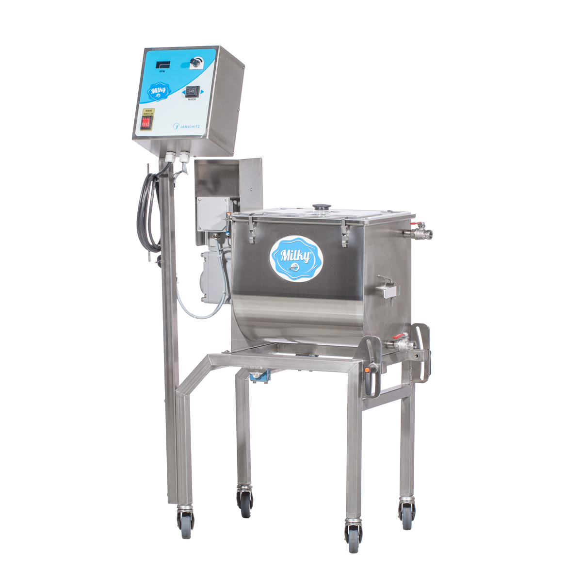 Der Pasteurisator, Käse- und Joghurtkessel Milky FJ 30 Midi Mix ist der mittlere Alleskönner unter den Mehrzweckkesseln. Weltweit ist dies der einzige dreiwandige Kessel in dieser Größe. Der Kessel kann nicht nur Milch, Obst, Fruchtsäfte und andere Flüssigkeiten pasteurisieren, sondern erreicht auch die für die Herstellung von Käse und Joghurt notwendigen Temperaturen. Der FJ 30 ist mit einem Mixer mit 100 U/min ausgestattet. Die eingebaute Heizspirale kann Ihr Produkt auf bis zu 92 °C in der 230V Variante erhitzen. Durch das innovative Bedienfeld können Zeit und Temperatur individuell eingestellt werden. Vor jeder Inbetriebnahme ist der Kessel mit Wasser zu füllen, da es sonst zu einer Fehlfunktion kommt.