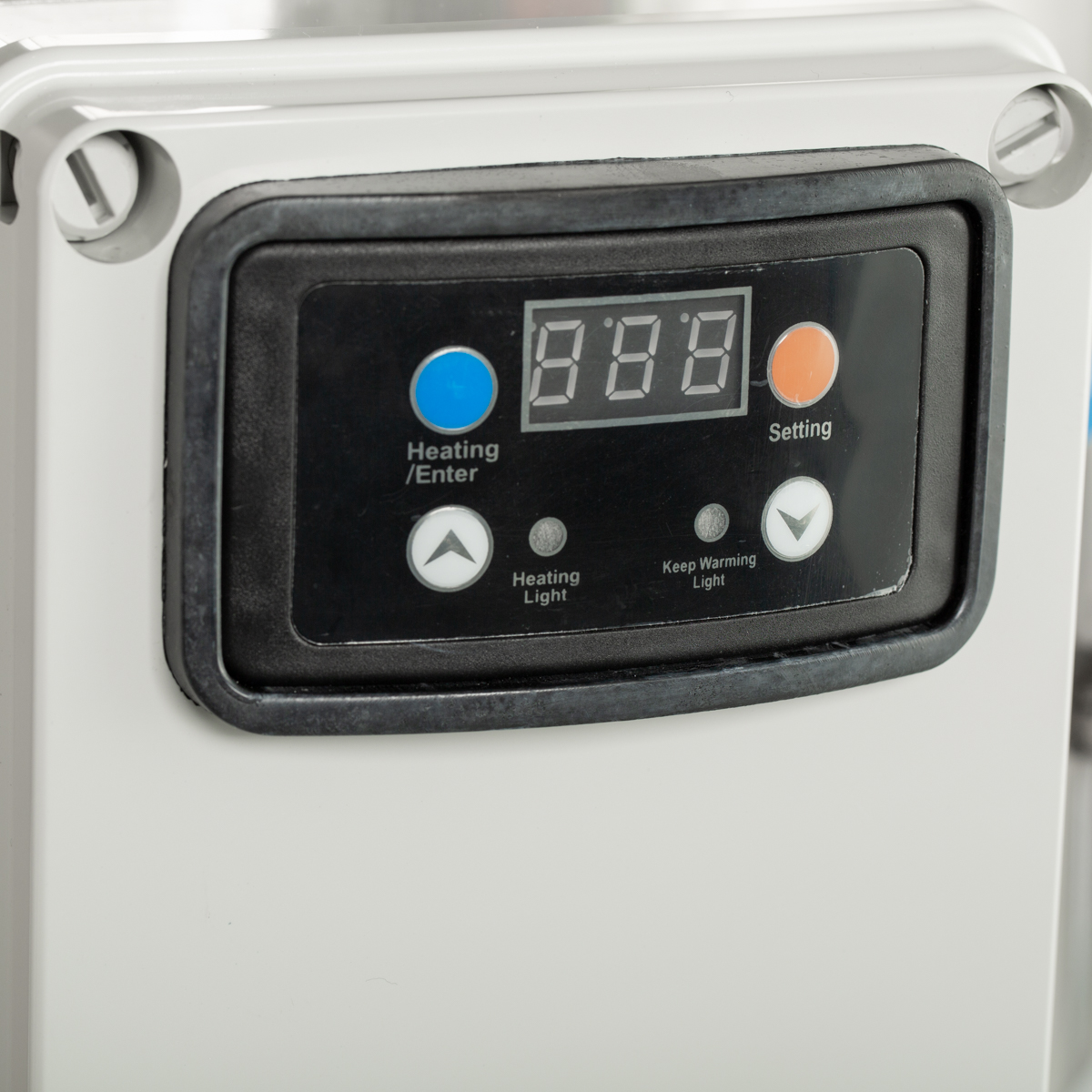 Der Milky FJ 15 Mini Pasteurisator, Käse- und Joghurtkessel ist der kleine Alleskönner unter den Mehrzweckkesseln. Weltweit ist dies der einzige dreiwandige Kessel in dieser Größe. Er kann nicht nur Milch, Obst, Fruchtsäfte und andere Flüssigkeiten pasteurisieren, sondern erreicht auch die für die Herstellung von Käse und Joghurt notwendigen Temperaturen. Die eingebaute Heizspirale kann Ihr Medium auf bis zu 92°C erhitzen. Durch das innovative Bedienfeld können Zeit und Temperatur individuell eingestellt werden. Zur Vermeidung von Fehlfunktionen ist der Kessel vor jeder Inbetriebnahme mit Wasser zu füllen. Im Falle einer Fehlfunktion setzen Sie das Gerät mittels Reset-Schalter am Boden zurück oder wenden Sie sich an einen lizenzierten Händler.