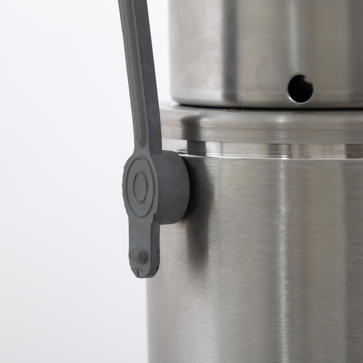 Das Vollmilchgefäß wird durch die Fixierhaken am Korpus gehalten und kann somit nicht verrutschen. Das Herz der Milchzentrifuge ist die Trommel. Diese ist am Nullpunkt ausbalanciert. Der obere Teil der Trommel ist aus lebensmittelechtem, eloxiertem Aluminium und die Scheiben sind aus rostfreiem Stahl gefertigt.