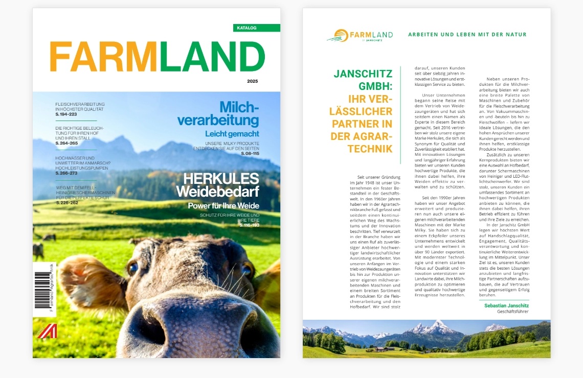 Unter dem Motto "Arbeiten und Leben mit der Natur" steht unser aktueller Produktkatalog ganz im Zeichen hochwertiger Produkte für die Agrar- und Landwirtschaft. Entdecken Sie unser reichhaltiges Sortiment im Bereich der Milchverarbeitung, Weidebedarf, Fleischverarbeitung, Schermaschinen und Hofbedarf und informieren Sie sich über die aktuellen Trends der Branche.